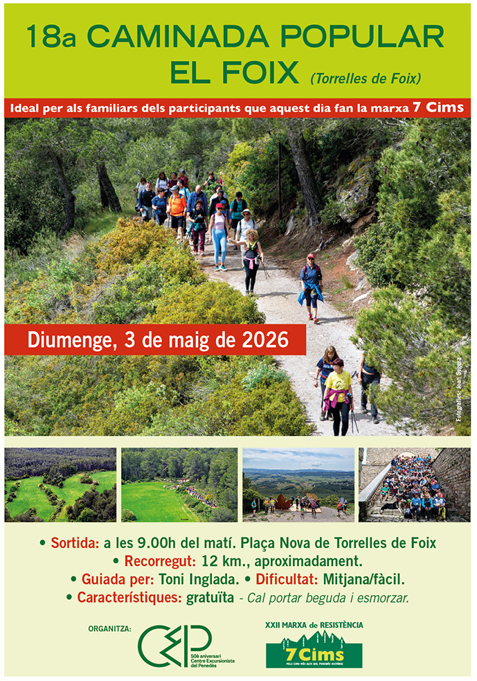 En el context de la ja consolidada marxa de resistència 7 Cims, que el 2026 celebrarà la seva 22a edició, torna també la caminada popular “El Foix”, que enguany arriba a la seva 18a edició. Aquesta sortida proposa un ascens a peu fins al Santuari de la Mare de Déu de Foix, patrona del Penedès, ubicat en un indret elevat i ple d’història. En aquest mateix punt s’alçava antigament el castell de Foix, documentat al segle XI i avui reduït a ruïnes.